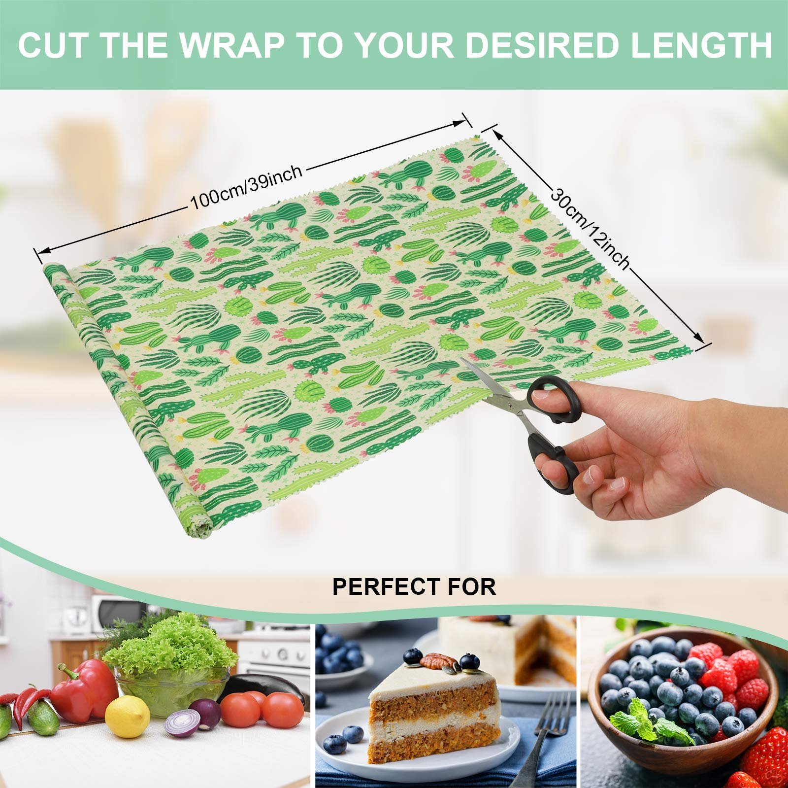 - EXTRA LARGE AND CUTTABLE WRAPS – 30 x 100 cm (12 x 39 inch). Can be cutted as needed. Natural alternative to plastic wrap. Wrap up cheese, fruit, vegetables, and bread. Cover a bowl or pack a snack when camping.