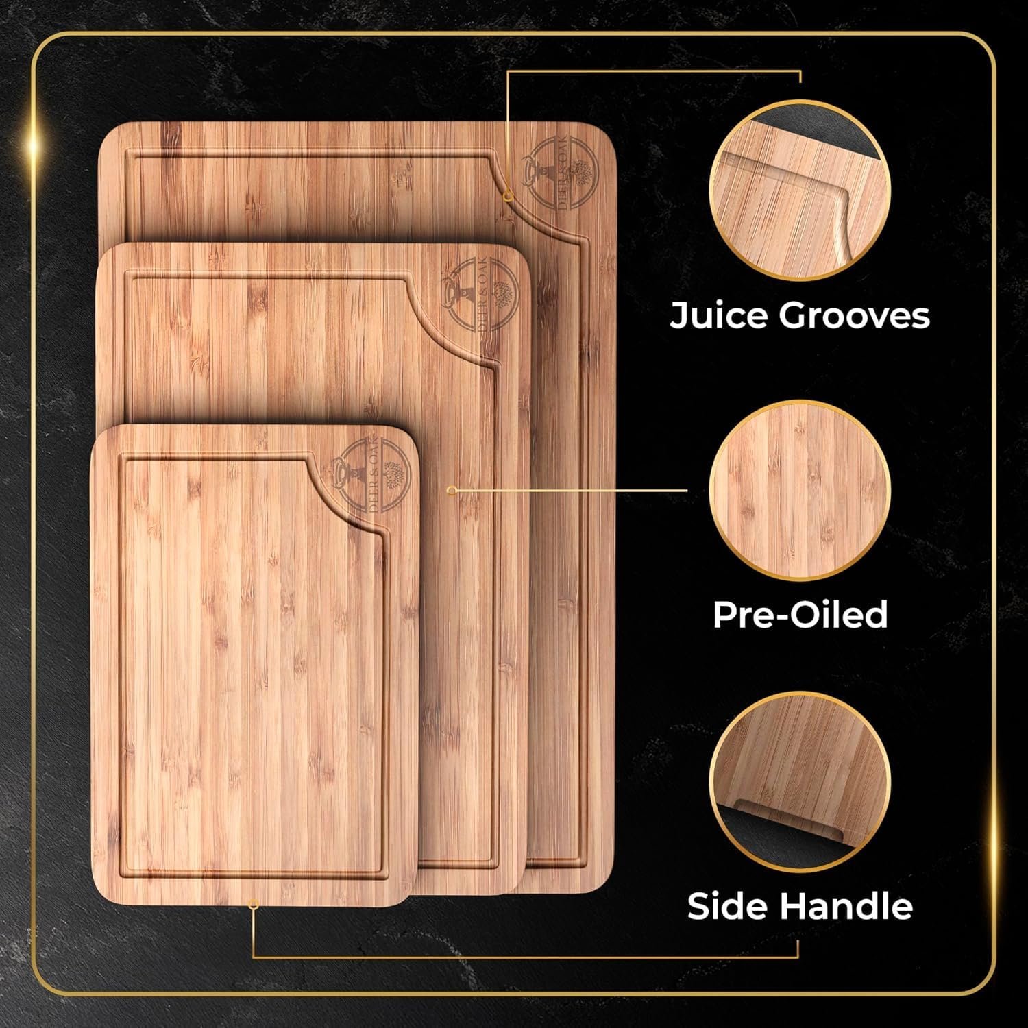 Deer & Oak 3-Piece Bamboo Chopping Board Set, Wooden Chopping Boards for Kitchen 36x24cm, 30x20cm, 22x15cm, with Side Handle and Grooves, Cutting Board