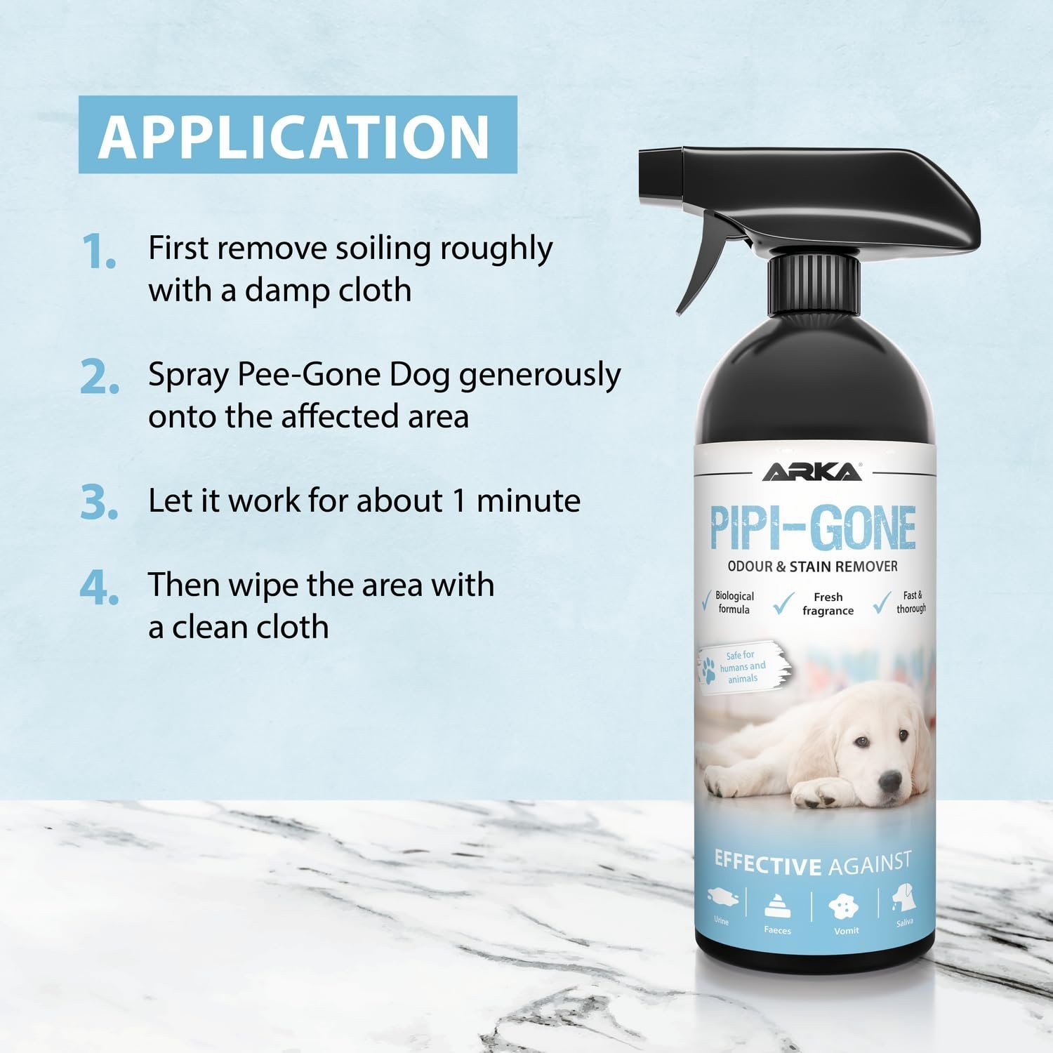 • Immediate & long-term effect – breaks down ammonia & uric acid within 24 h – stops re-marking – 48 h residual activity – safe for all dog life stages.