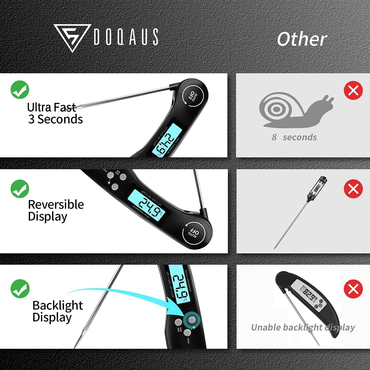 DOQAUS Digital Meat Thermometer, Instant Read Food Thermometer with Backlight LCD Screen, Foldable Long Probe & Auto On/Off, Perfect for Kitchen, BBQ, Water,Meat, Milk, Cooking Food (Black)