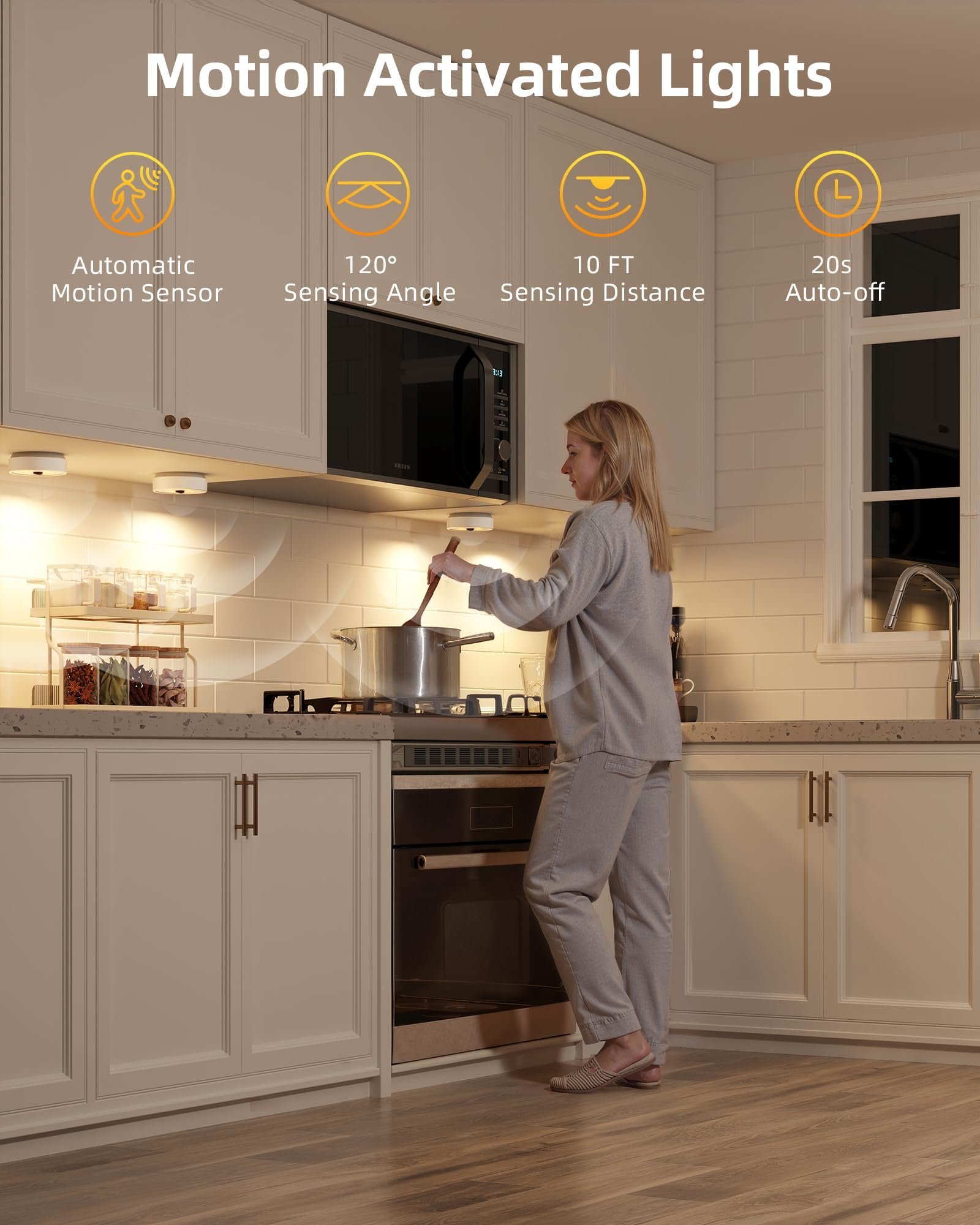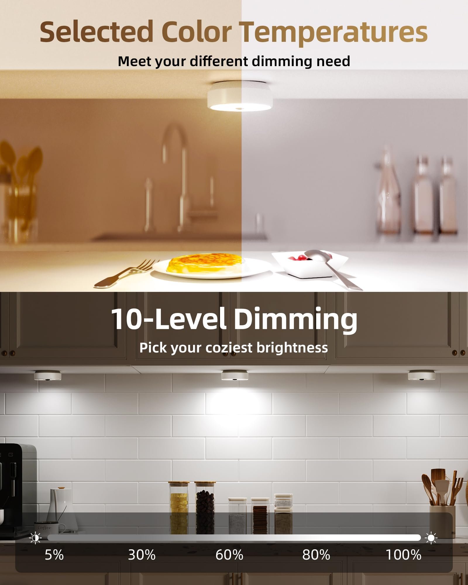 - 【Broad Application】 — Size: 1.2 x 3.3 x 3.3 inch, compact and handheld, it is suitable for all kitchen cabinets size. These puck lights battery operated are ideal as closet lights, under cabinet lights,wine cabinet lights, display lights, office lights, under counter lights for kitchen. Adding this hands-free rechargeable cabinet lighting to your home.