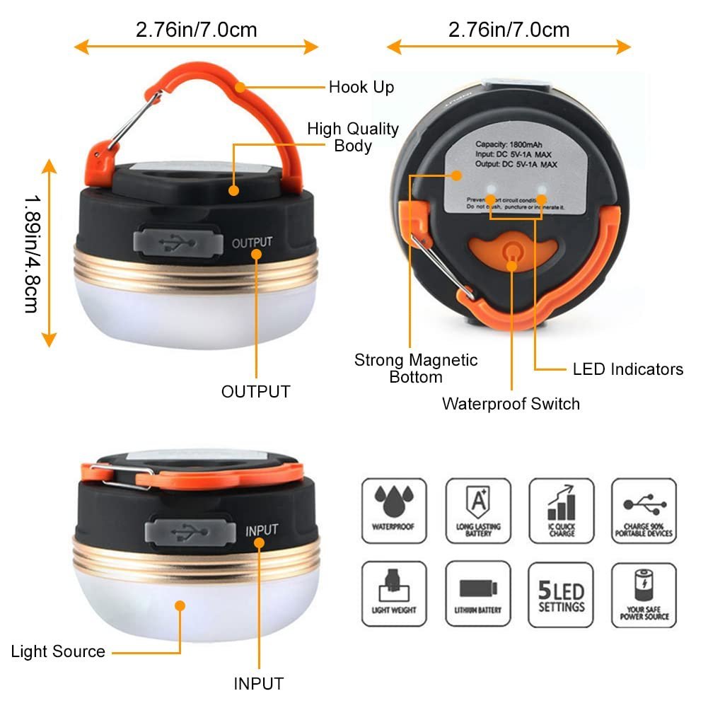 - 🔋【1800mAh CAPACITY】- This camping light has a built-in 1800mAh rechargeable battery for long-term lighting, with our camping light you will not have to worry about your phone shutting down during outdoor activities or power outages, it can be used as an emergency power source to charge your smartphone or other devices via a micro USB cable.