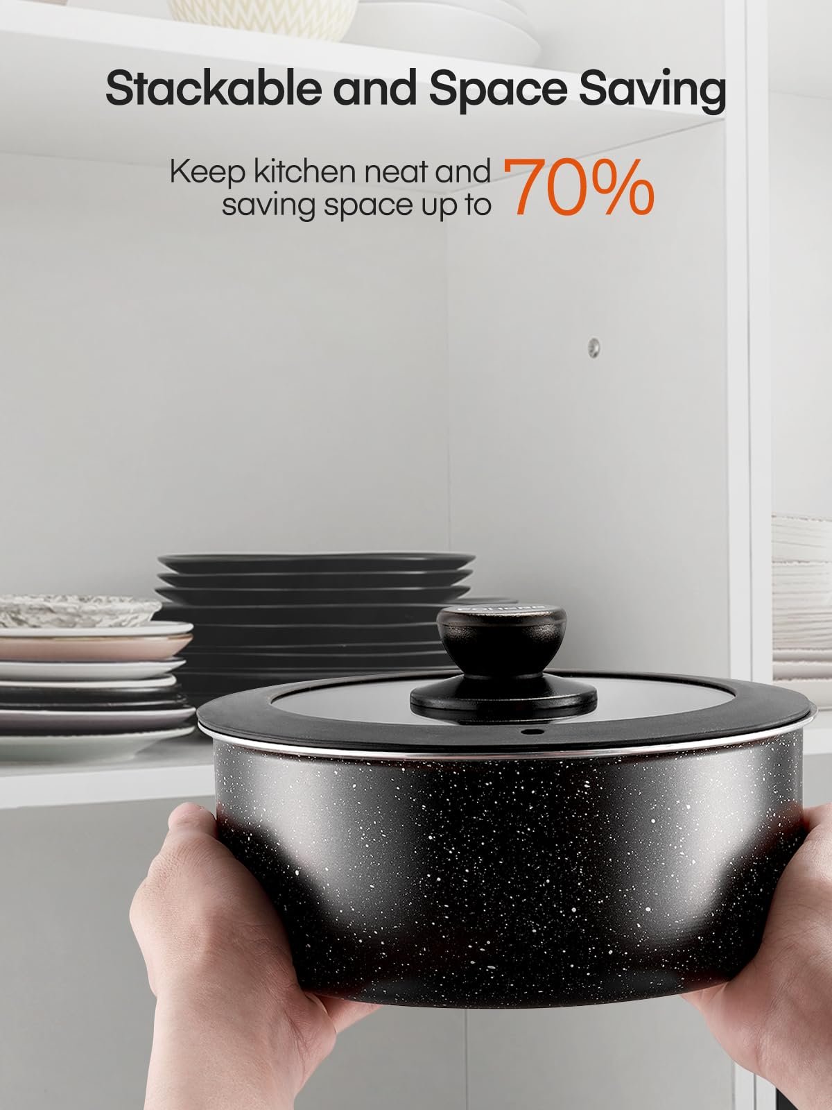 • Non Stick Pots and Pans Set: Applied with safe and harder nonstick coating, this set of cooking pot is PFOS/PFOA free and non scratched, ensuring healthy cooking and long-lasting pot . Nonstick coating is for easy cooking and cleaning.