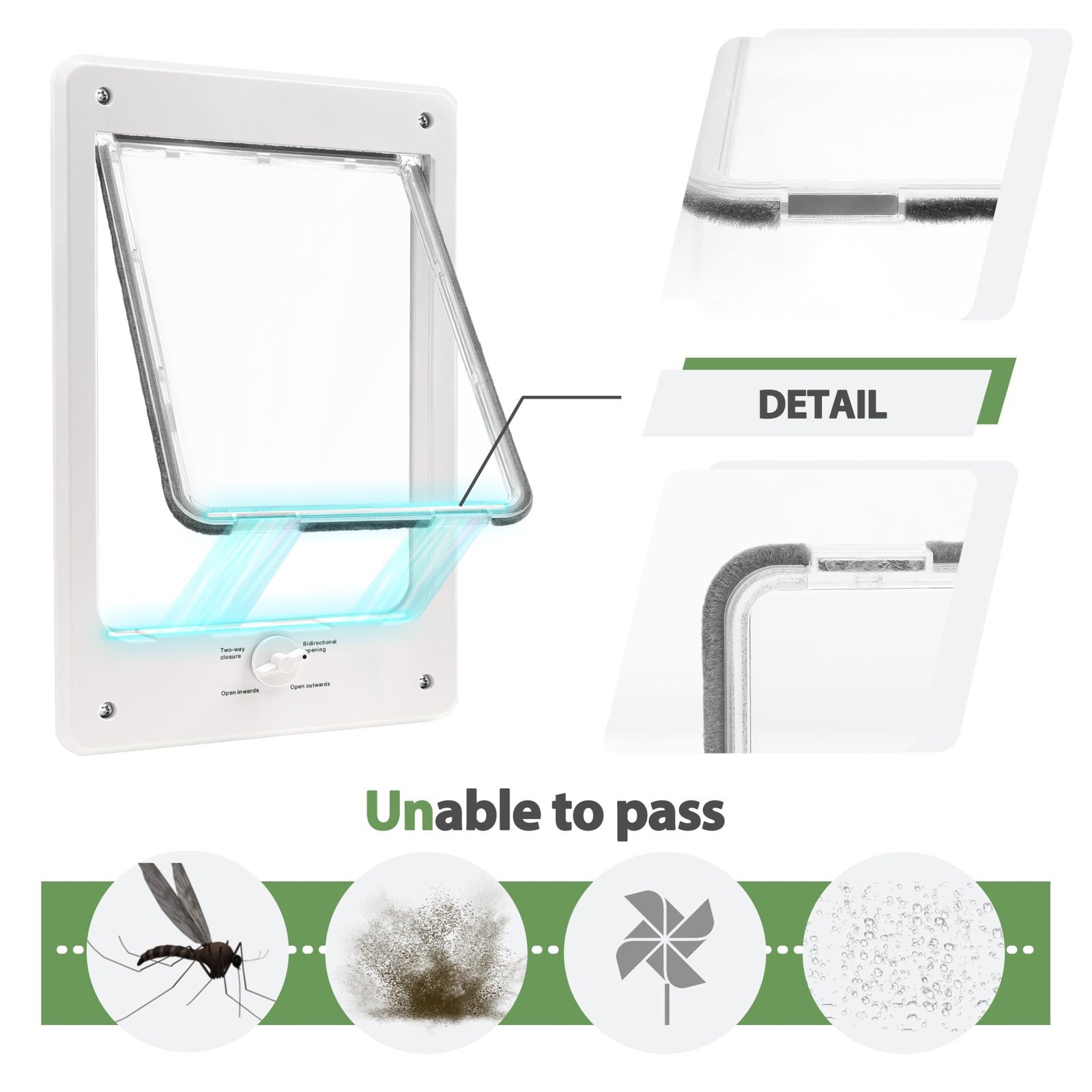 - 【MULTI-MODE LOCK】This pet door for window lock integrates four locking mechanisms: two-way closing, two-way opening, outward opening, and inward opening. The tightness of the door lock has been adjusted to achieve an ideal state that is both easy to operate and difficult to move by lively pets.