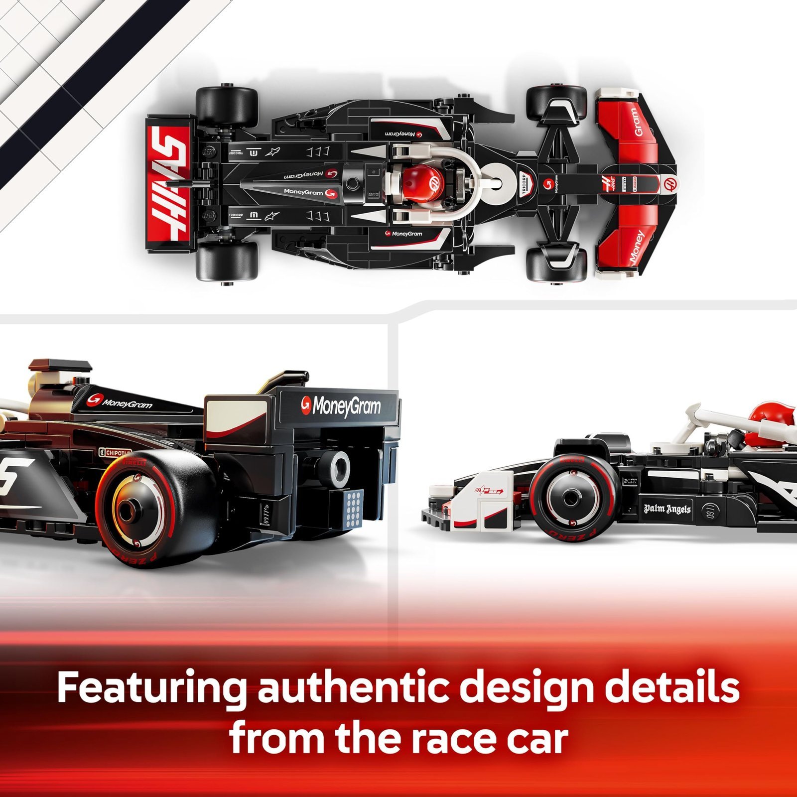 - 1 minifigure – The F1 toy car includes a driver minifigure in a MoneyGram Haas F1 Team outfit and helmet, ready to be placed inside the car’s cockpit
