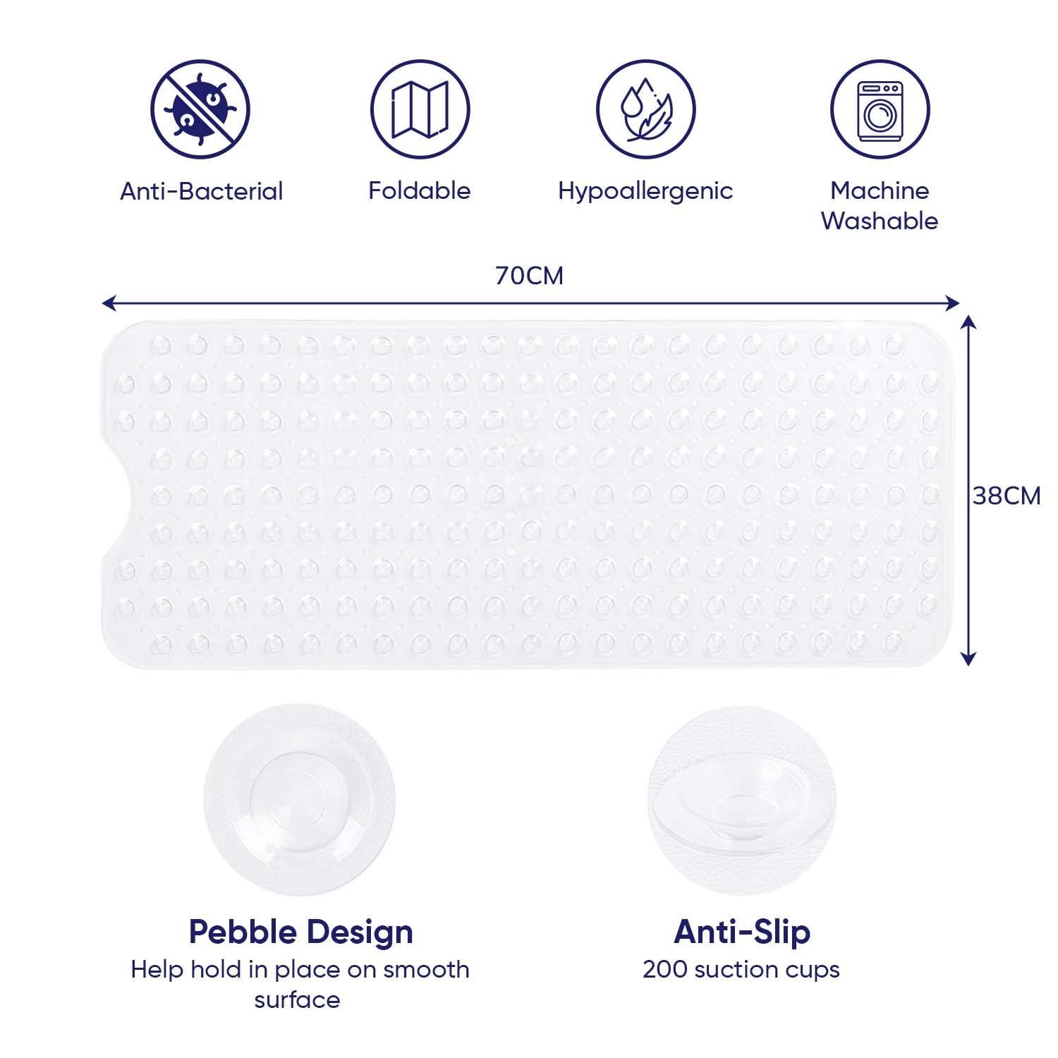 - HIGH QUALITY & DURABLE: Our bath matt is suitable for all types of bathtubs, bathrooms & shower areas. Made from durable high-grade PVC with rubber back that is antibacterial, mildew & mould proof. It can be used in the home, as well as in hotels and other hospitality venues.