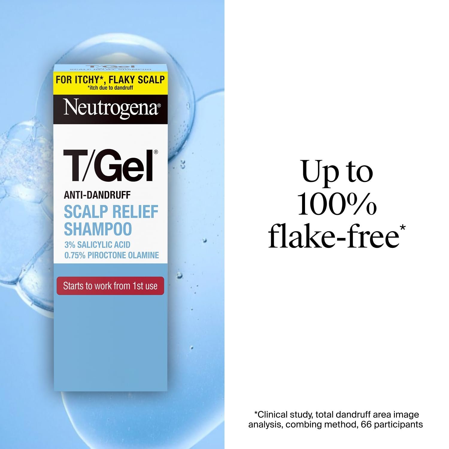 Neutrogena T/Gel® Anti-dandruff Scalp Relief Shampoo starts to fight dandruff from the first wash. Our highest concentration, extra power formula is clinically proven to help relieve, reduce and prevent your dry, itchy* flaky scalp. 100% showed improvement in dandruff and scalp dryness**.