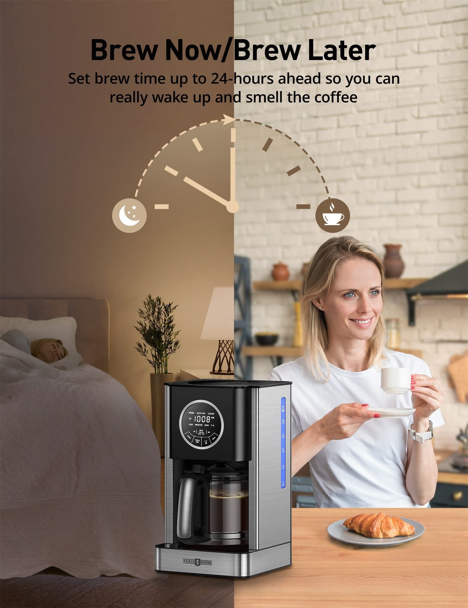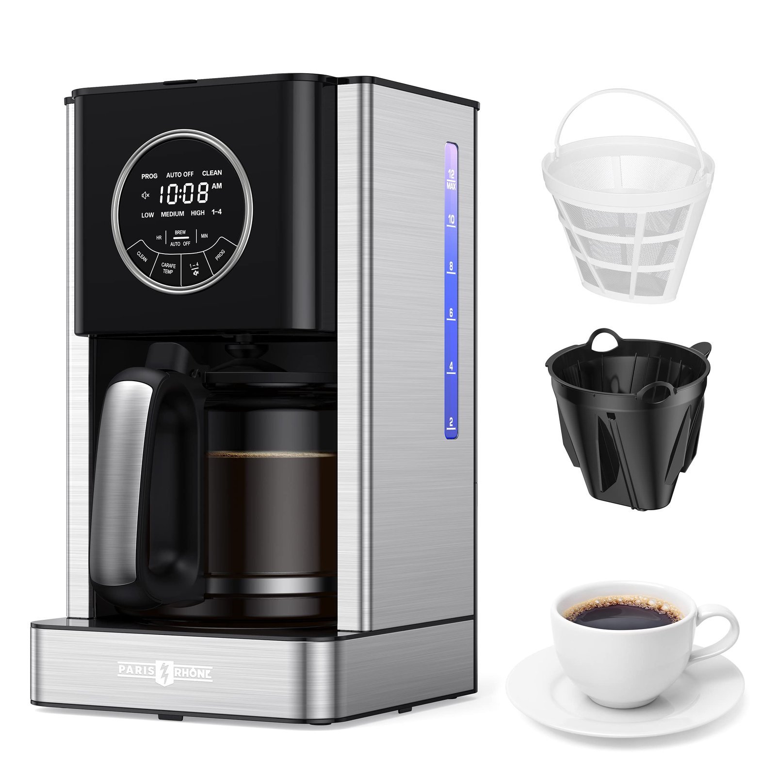 - 12 Cup Large Capacity – Enjoy a tasty brew anytime with the Paris Rhône drip coffee maker; ideal for large households or workplace kitchens, the large capacity model brews up to 12 cups of full-flavored coffee at a time