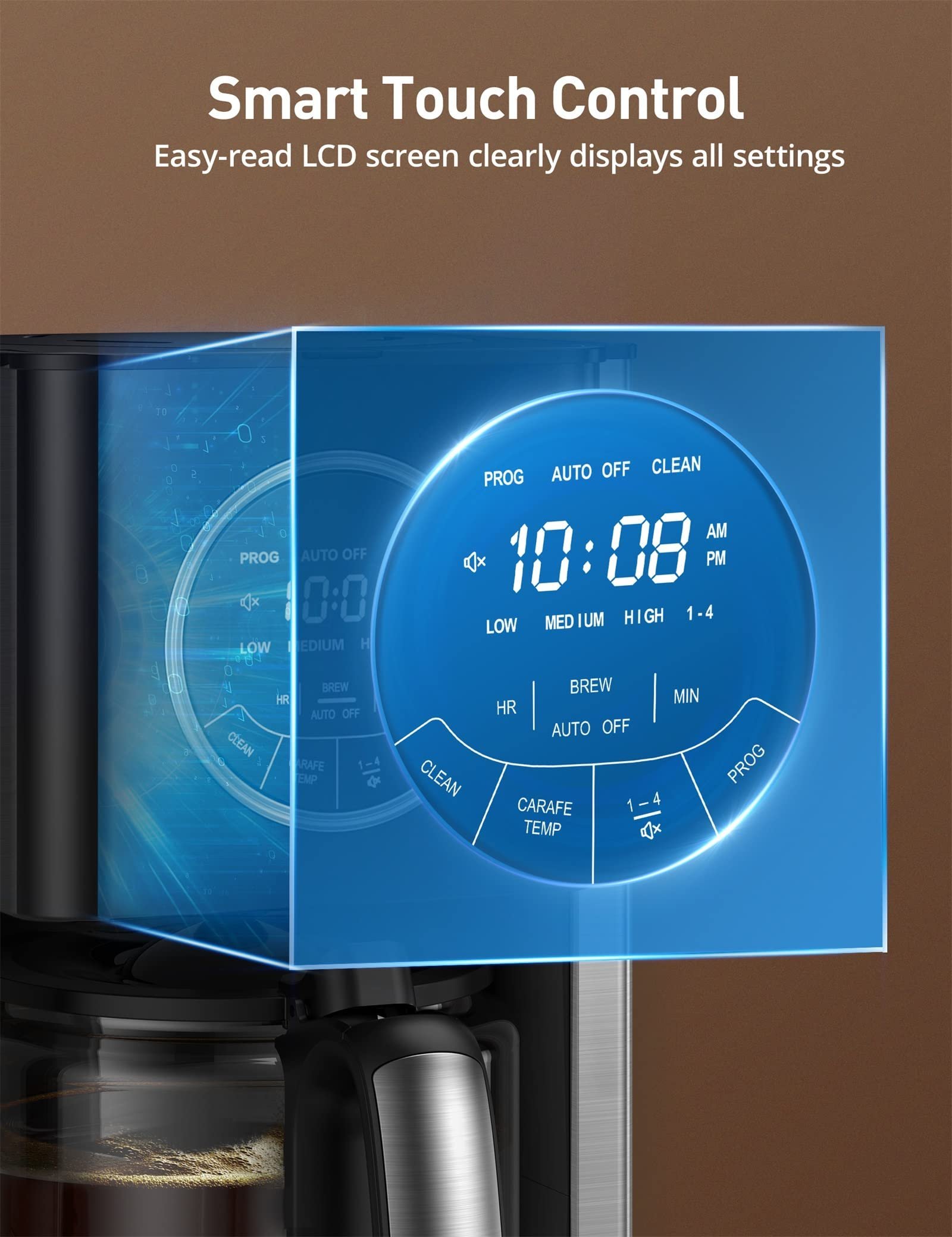 - Smart Functionality – Intuitive touch control panel gives you full control of the coffee machine while the easy-read LCD screen clearly displays all settings; the anti-drip system stops the flow of coffee once carafe is removed, preventing mess and spills