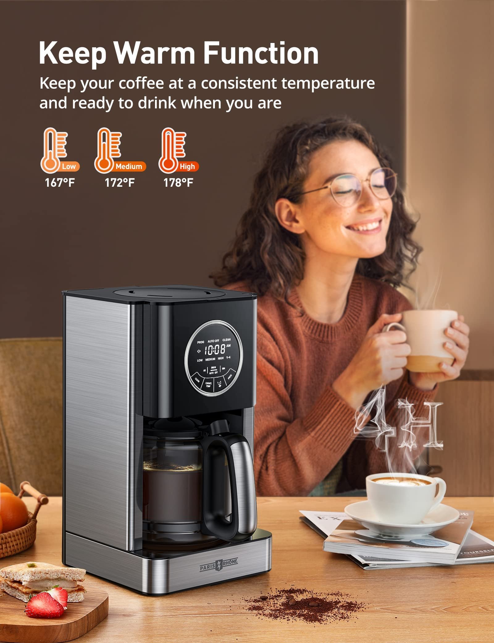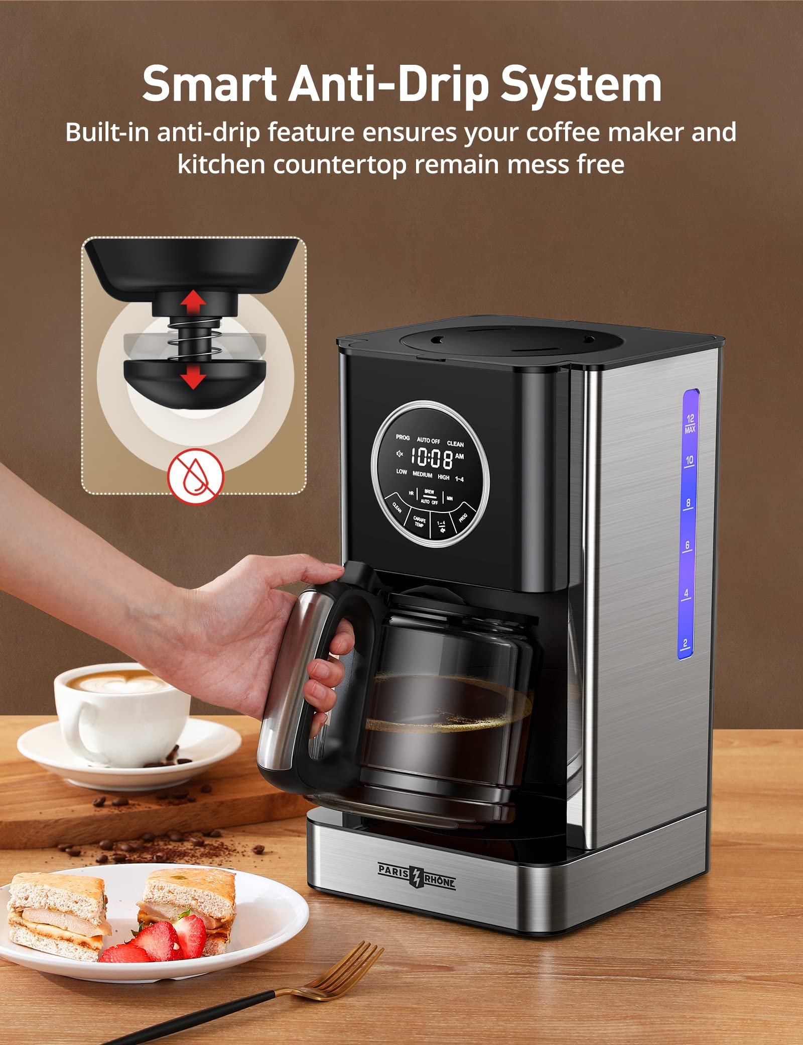PARIS RHÔNE 12-Cup Coffee Maker, Drip Coffee Machine with Glass Carafe, Keep Warm, 24H Programmable Timer, Brew Strength Control, Touch Control, Anti-Drip System, Self-Cleaning Function, 1.8L, 1000W