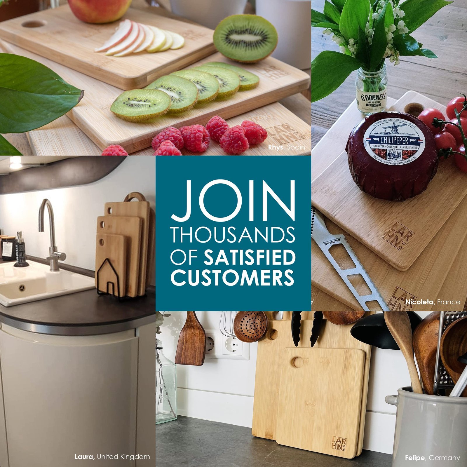 - ✅ HIGH QUALITY – NO MORE BROKEN CHOPPING BOARDS. Exclusively designed to use the natural grain of bamboo in different directions for superior strength. These strong and durable 1.5cm thick chopping boards won’t bend or break like thin or single-layer versions. LARHN is so confident, they offer a lifetime warranty.