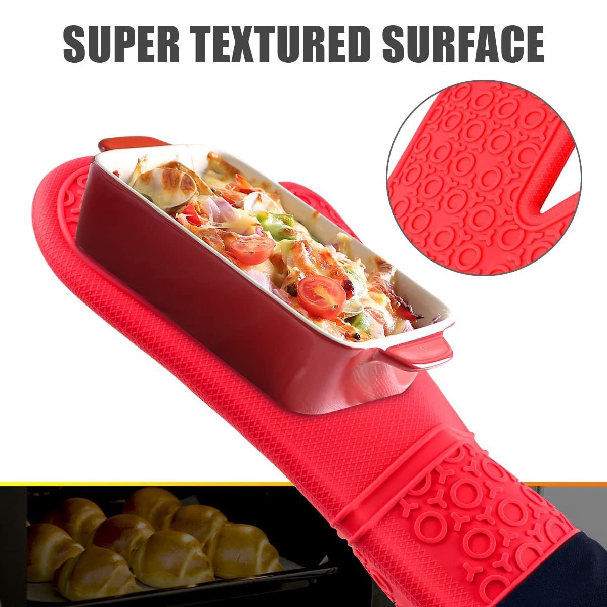 - Non Slip & Waterproof: Professional oven gloves heat resistant feature textured surfaces, provides good grip for holding heavy trays, pots and utensil. And silicone oven gloves are waterproof and not easy to get greasy.