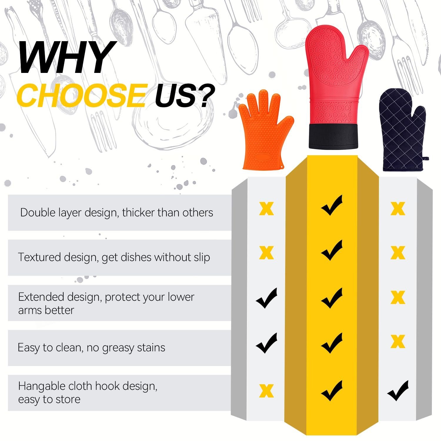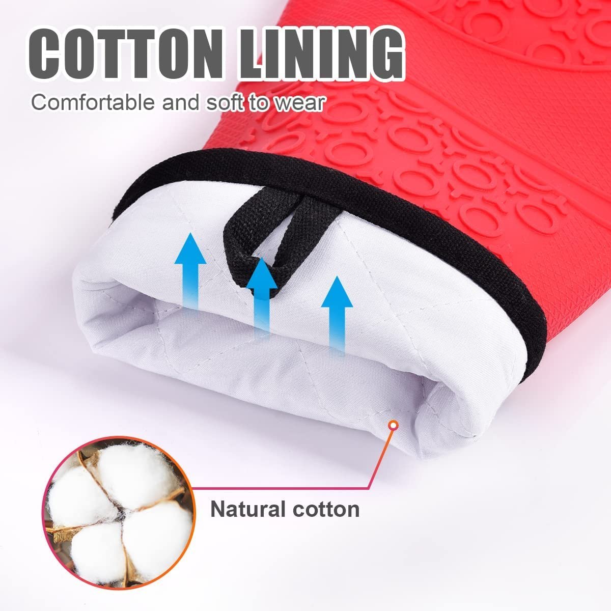- Comfort: The silicone oven gloves use high quality silicone material for outer, soft polyester cotton for lining, well padded so that silicone oven gloves are comfortable to grip. They are highly recommended kitchen accessories and widely used for cooking, microwave oven.
