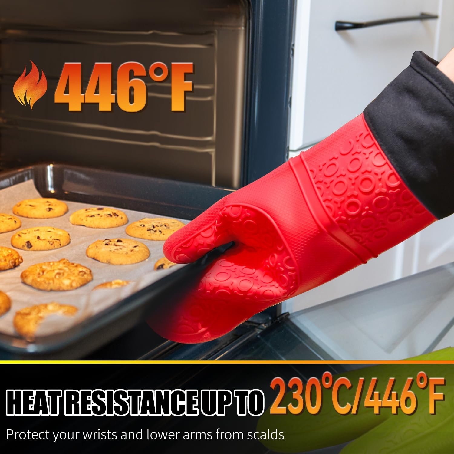 - Heat Resistant Oven Gloves: Our silicone oven gloves heat resistant are made of food grade silicone and high-performance breathable quilted cotton lining, thermo-resistance is up to 230°C / 446°F. The heat resistance of oven mitts are better than cloth in steam or oven, protecting your wrists and lower arm when getting things out of the oven.