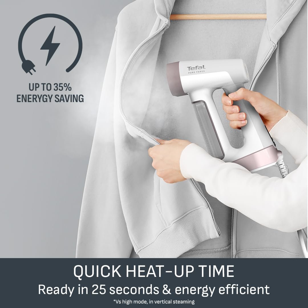 Tefal PureForce 2-in-1 Handheld Garment Steamer, Vertical steaming & Horizontal ironing, Boost & Eco modes, 25 second heat up, 180ml removable tank, 4 steam settings, DT8720G0, Pink and White