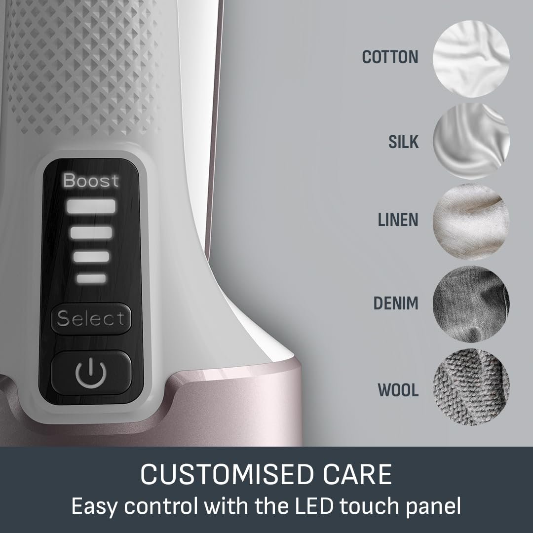 - CUSTOMISED CARE: With four power modes, this steamer delivers tailored steaming for different fabric types—from tough denim to delicate fabrics. The easy-to-use LED touch panel allows for intuitive control, giving you the right amount of steam for every garment.