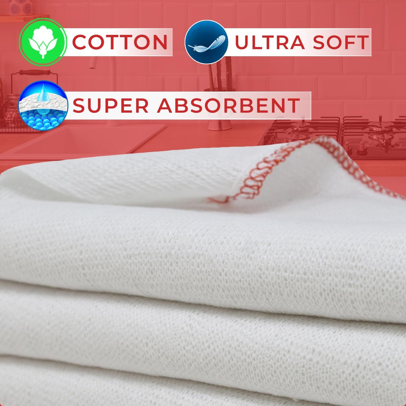 Towelogy Jumbo Dish Cloths for Washing Up | Cotton Set of 4-38 x 45cm (White/Red Edges)