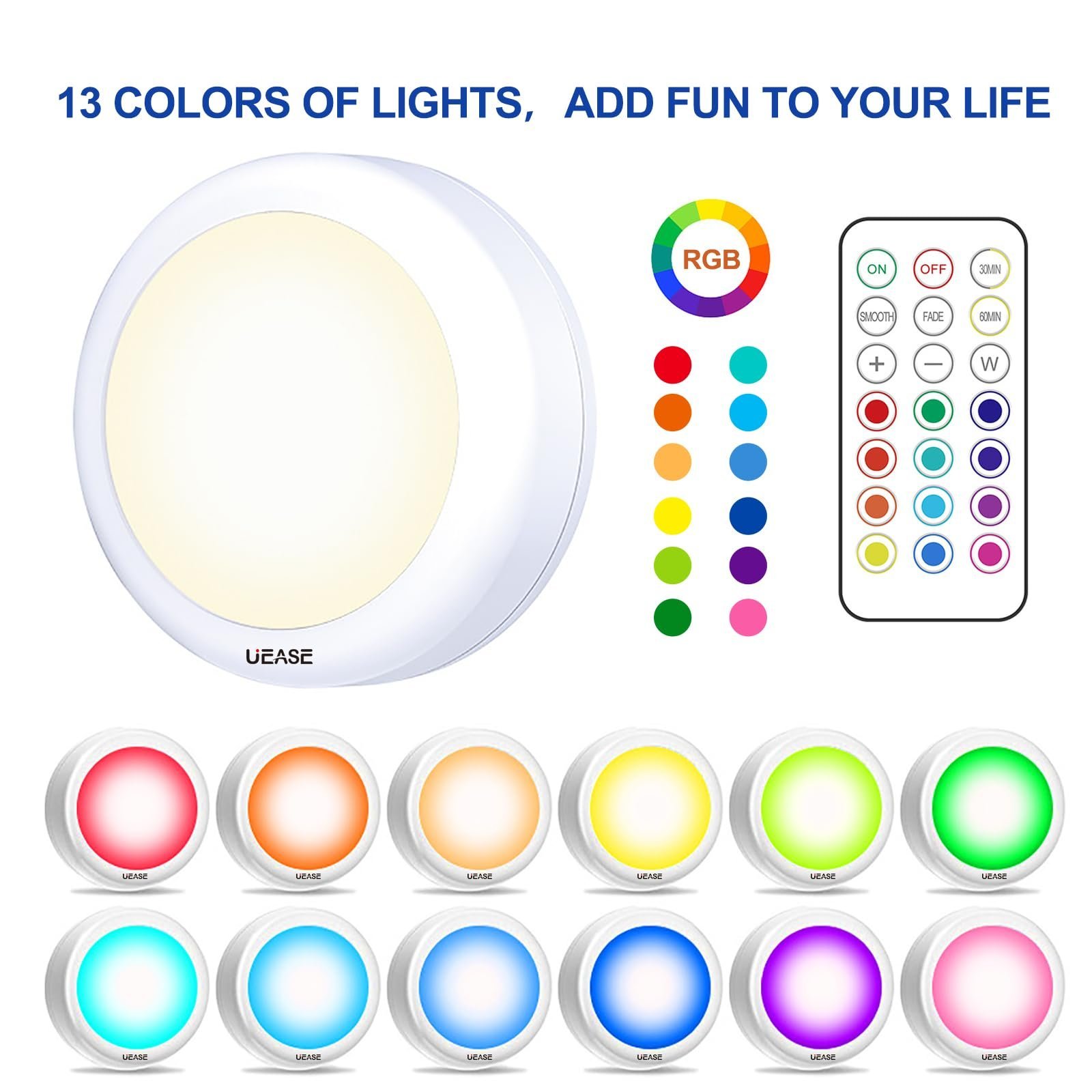 UEASE Under Cabinet LED Lights with Romote, 3PCS RGB Light Wireless Lights Battery Powered Puck Lights Under Cupboard Tap&Remote Control, 13 Colors, Dimmable, Timer, for Kitchen Bedroom